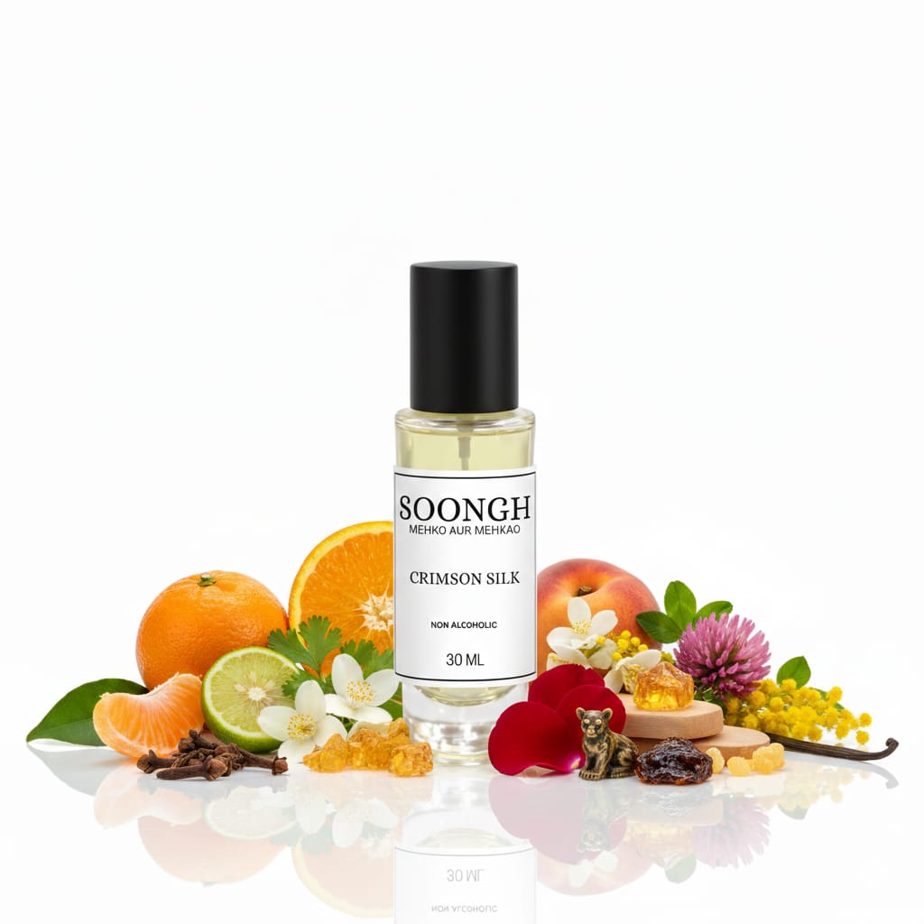 Opulent, bold, and irresistibly feminine—Crimson Silk by Soongh perfumes in Pakistan is a fragrance that speaks of timeless elegance wrapped in passionate mystery. Designed perfumes in Pakistan for the woman who commands attention with grace and allure, this scent is a perfect blend of classic charm and modern sensuality. With its warm, spicy-floral essence, Crimson Silk is your statement of confidence, luxury, and unforgettable style.