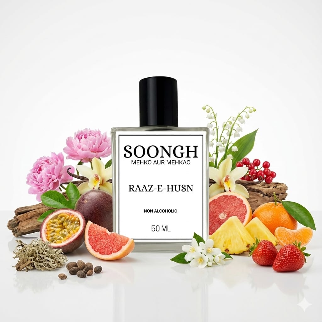 Raaz-e-Husn unfolds with a sparkling burst of passionfruit, grapefruit, and pineapple, inviting the senses into a lush, fruity opening. The heart blooms with romantic notes of peony, vanilla orchid, and jasmine, offering a floral sweetness that is both refreshing and seductive. Finally, a warm and sultry base of musk, oakmoss, and woody notes anchors the fragrance, giving it depth, sensuality, and an unforgettable signature.
